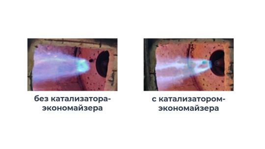 При установке катализатора-экономайзера факел претерпевает некоторые изменения: расстояние от амбразуры горелки до основания факела уменьшается при пропуске потока газа через Катализатор-Экономайзер. Кроме того, уменьшается в размерах и «корона» факела.